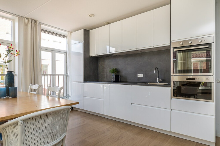 Hal, Toilet met fontein, ruime lichte woonkamer met laminaat, volledig uitgeruste ingerichte MODERNE NIEUWE open keuken met alle gewenste inbouwapparatuur.