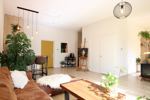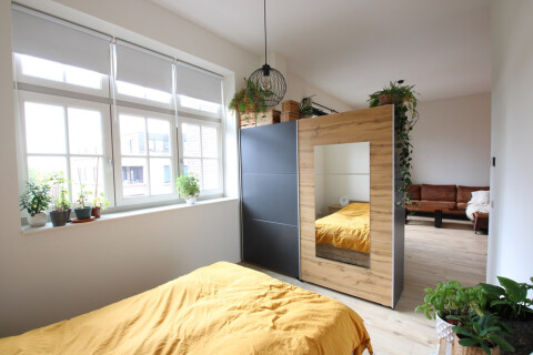 Lift of trap naar 2e verdieping: entree, met hele hoog plafonds bijzonder L-vorm open woon/slaapkamer met complete keuken (vv vaatwasser, combi-oven, koelkast met vriesvak en afzuigkap). Zeer ruime berging met aansluitingen voor wasmachine en droger en toegang tot balkon. Een deel van het appartement is afgescheiden door de kasten om een heerlijk licht slaapruimte te maken. Deze kast is tevens ter overname van de vorige huurder. Ruim badkamer met inloopdouche, wastafel en toilet.